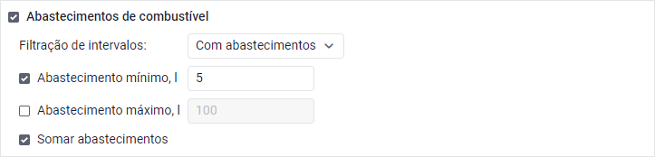 Este filtro permite visualizar os intervalos dentro em que os abastecimentos de combustível foram detectados e também intervalos sem abastecimentos. Nos campos Abastecimento mínimo e Abastecimento máximo, deve-se especificar o volume de abastecimento mínimo ou máximo para que este seja incluído nos intervalos do relatório.