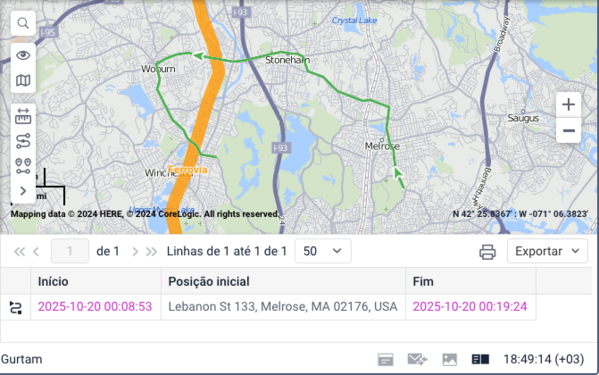 Exemplo. Na imagem abaixo, a tabela Viagens é filtrada pelo critério Dentro da cerca eletrônica “Ferrovia”. Ela inclui uma viagem durante a qual o veículo enviou mensagens dentro desta cerca eletrônica, embora apenas brevemente.