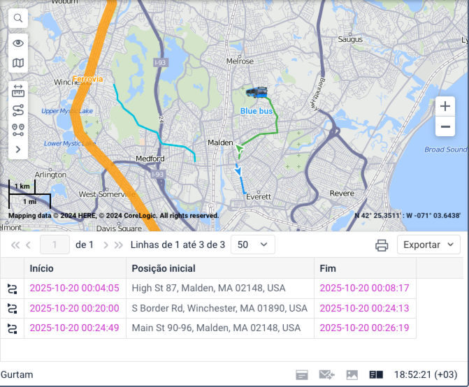 Com viagens | O relatório mostra intervalos em que uma viagem foi detectada, mesmo que apenas uma parte dela esteja incluída no intervalo. |