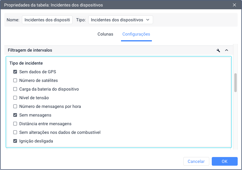 Se você deseja incluir apenas certos tipos de incidentes na tabela, marque-os na lista.