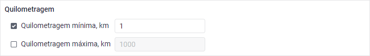 Neste filtro é possível especificar a quilometragem máxima e/ou mínima necessária para o intervalo a ser incluído no relatório. Valores fracionários são permitidos usando um ponto.