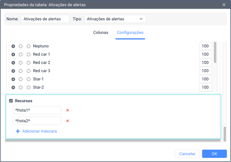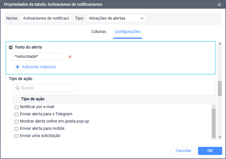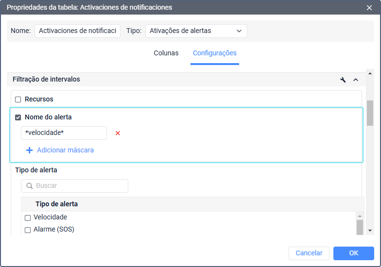 Aqui você pode especificar máscaras para os nomes de alertas acionados.