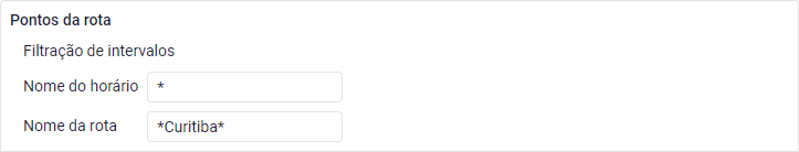 Este filtro está disponível na tabela Pontos de controle. Nele é possível especificar máscaras para horários e/ou rotas nos campos Nome do horário e Nome da rota, respectivamente. Neste caso o relatório mostrará apenas os pontos de verificação relacionados aos horários e/ou rotas especificadas.