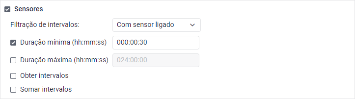 | Somar intervalos | Esta opção só pode ser utilizada se os campos Duração mínima e/ou Duração máxima estiverem preenchidos. Se habilitada, somam-se todos os períodos em que o sensor esteve ligado ou desligado dentro do intervalo do relatório e o resultado é comparado com o valor de duração especificado. Caso o valor atenda à condição, o intervalo será mostrado no relatório. Exemplo. Um relatório de viagens com o sensor ligado é executado. O valor de 60 segundos é indicado no campo Duração mínima. A opção Somar intervalos está ativada. Durante a viagem, o sensor ficou ligado por 20 segundos, por 30 segundos e depois por 15 segundos, ou seja, um total de 65 segundos. Este valor atende à condição de duração mínima, portanto, a viagem será mostrada no relatório. |