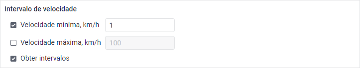 Nos campos Velocidade mínima e Velocidade máxima é possível definir a velocidade mínima e/ou máxima da unidade para que o intervalo seja incluído no relatório.