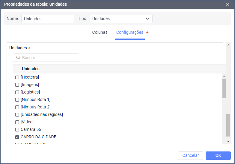 A tabela Unidades requer a seleção de unidades no filtro.