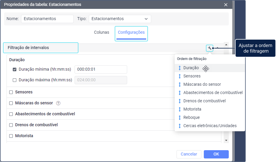 Ao executar a maioria dos relatórios tabulares no sistema Wialon, os intervalos de tempo correspondentes ao tipo de tabela são recuperados do histórico da unidade. Por exemplo, os intervalos referem-se às viagens da unidade em um relatório sobre viagens, enquanto em um relatório sobre cercas eletrônicas, os intervalos se referem à unidade estar dentro de uma cerca eletrônica. É possível filtrar esses intervalos com base em determinados parâmetros. O relatório pode mostrar, por exemplo, apenas as viagens que duraram mais do que o tempo especificado ou apenas as visitas à cercas eletrônicas durante as quais o veículo estava estacionado.