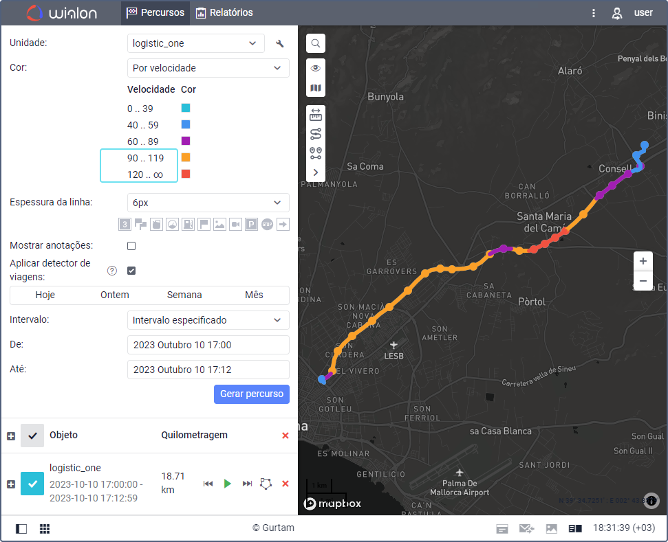 Exemplo 2. Um relatório sobre viagens é executado. Sabe-se que a unidade viajou em velocidades acima de 90 km/h durante o período de tempo especificado. No percurso da unidade, a velocidade acima de 90 km/h é marcada em laranja; acima de 120 km/h é marcada em vermelho. O usuário deve mostrar no relatório apenas os segmentos em que a unidade viajou a uma velocidade de 89 km/h ou mais (Figura 1).