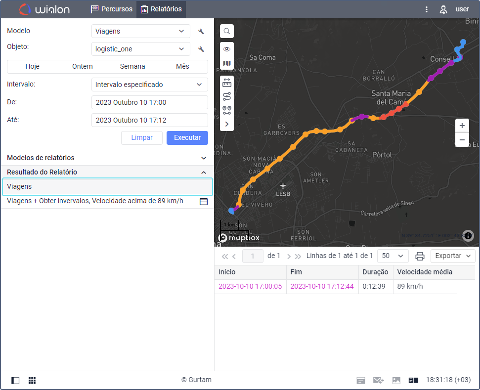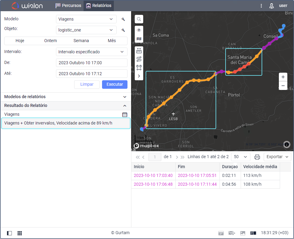 Para isso, no filtro Intervalo de velocidade, especifique um valor mínimo de 89 km/h. Se você executar o relatório com essa configuração, todo o intervalo em que a velocidade foi superior a 89 km/h será exibido (Figura 2).
