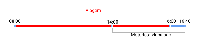 Exemplo 1. O filtro Com motorista é usado em um relatório sobre viagens. A viagem durou das 08:00h às 16:00h. O motorista foi vinculado à unidade às 14:00h e separado dela às 16:40h. Se a opção Obter intervalos estiver desabilitada, o relatório mostra toda a viagem das 08:00h às 16:00h.
