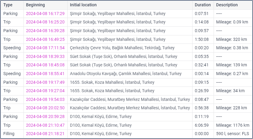 | Tipo | Viagem, estacionamento, parada, horas de motor, abastecimento de combustível (ou abastecimento registrado), dreno de combustível, evento (ou infração), motorista, perda de conexão, sensor. |