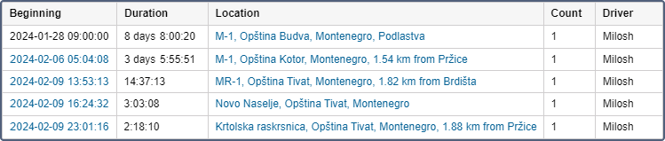 A tabela Problemas de conexão lista os períodos de tempo em que o sistema não recebeu dados da unidade. Os parâmetros para esta tabela são ajustados na aba Avançadas das propriedades da unidade, onde se define Intervalo máximo entre mensagens.