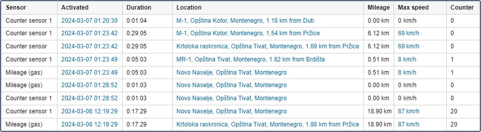 A filtragem de intervalos pode ser aplicada à tabela Sensores contadores: por duração, quilometragem, horas de motor, intervalo de velocidade, viagens, paradas, estacionamentos, sensores, motoristas, abastecimentos de combustível, drenos de combustível, cargas de bateria e cercas eletrônicas/unidades.