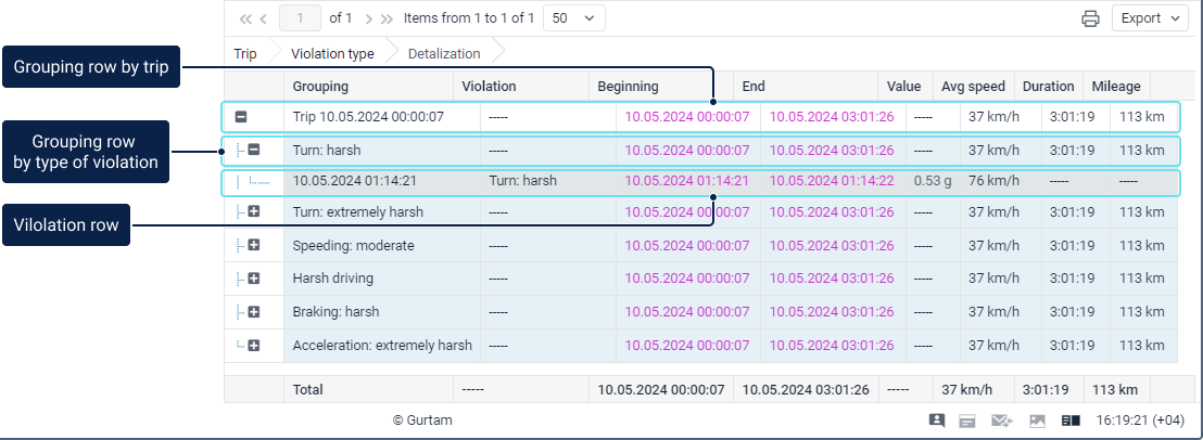 Para além do agrupamento, pode ser aplicada uma opção de detalhamento. Esta opção permite visualizar o nível final de agrupamento (data e hora) dentro do agrupamento. No entanto, tenha em consideração que uma penalidade e classificação podem ser atribuídas a uma infração que ocorreu num determinado intervalo de tempo (não imediatamente). É por isso que, no nível final de aninhamento (data e hora), é apresentado um traço na coluna Classificação, e a coluna Pontuação recebe o valor indicado na aba Condução Ecológica das propriedades da unidade.