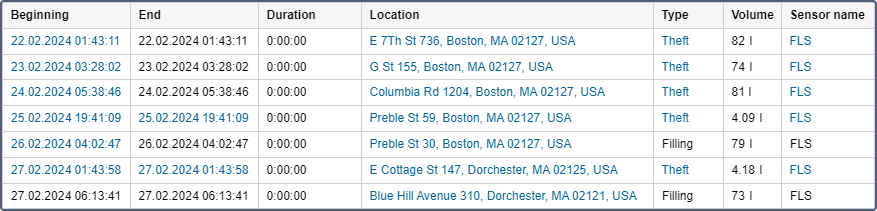 | Fim | O horário de desativação do sensor, o horário do abastecimento ou dreno de combustível dependendo do tipo. |