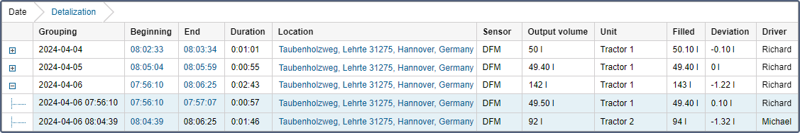 Se nos parâmetros de filtragem existirem outras unidades seleccionadas e que no momento da atividade estivessem próximas da unidade para a qual se executa o relatório, é executado o algoritmo de análise de abastecimentos de combustível. Assim, ao executar, por exemplo, um relatório sobre um camião-tanque, é possível ver não só a sua atividade de combustível, mas também a quantidade de combustível recebida pelas unidades próximas (pelo menos uma mensagem dessas unidades deve ser recebida durante o intervalo de atividade a uma distância menor que o raio especificado nos parâmetros de filtragem).