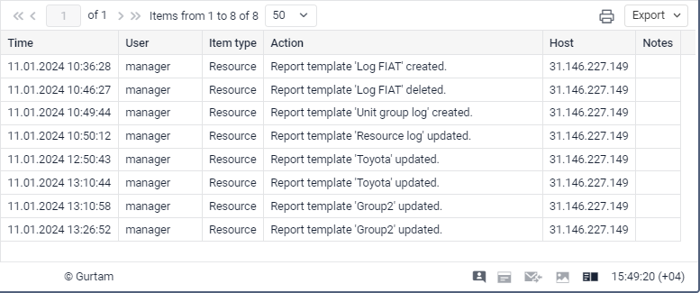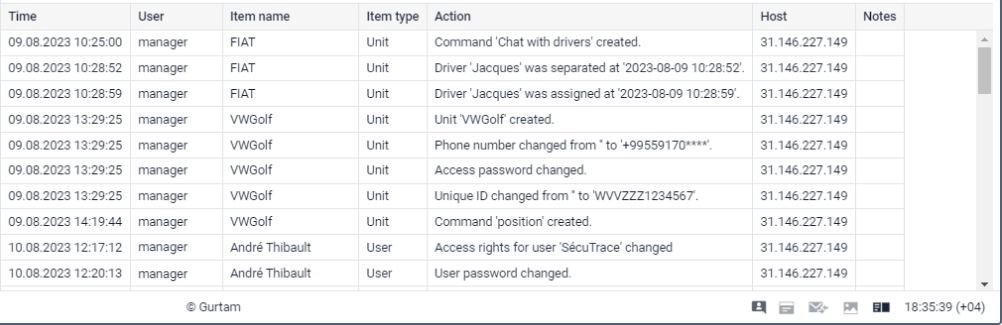 A tabela Histórico contém registros sobre as alterações feitas por usuários nas propriedades do objeto ou em seu conteúdo. Diferentemente do histórico do sistema de monitoramento ou gerenciamento, a tabela não mostra registos sobre erros, recebimento de mensagens de uma unidade, etc.