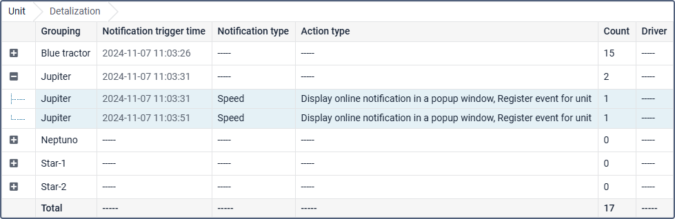 Quantidade | Número de ativações de alertas. Para linhas com ativações de alertas única, o valor é sempre 1. Recomenda-se que você use essa coluna em combinação com o parâmetro Agrupamento ou a linha Total. Se a linha Total estiver configurada na tabela, você poderá ver o número total de ativações de alertas para o período e a unidade ou o grupo de unidades selecionados. |