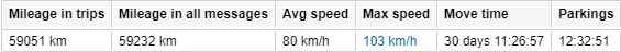 | Quilometragem em todas as mensagens | A quilometragem total do intervalo de relatório, registrada pelo contador de quilometragem. |