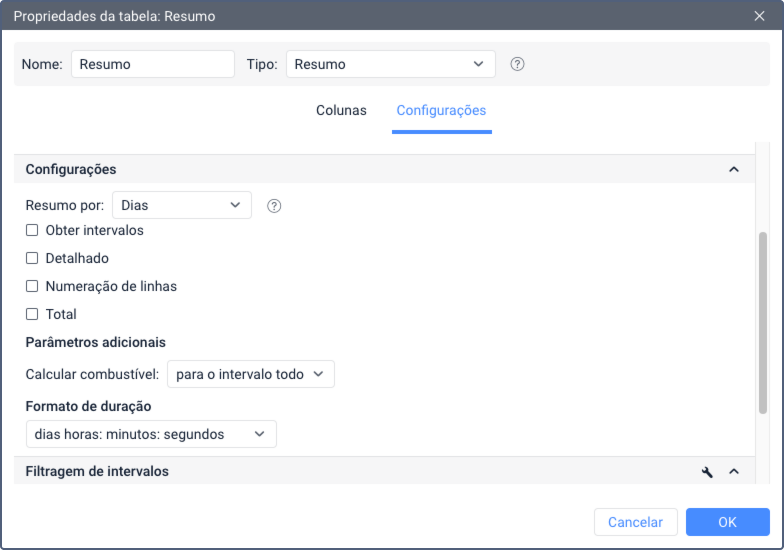O combustível pode ser calculado para todo o intervalo, em viagens ou em horas de motor, o que é selecionado nos parâmetros adicionais da tabela. Esta opção afecta colunas como Consumido e Consumo médio.