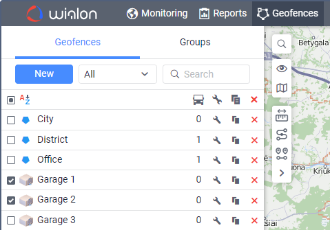 Também é possível usar unidades como “cercas eletrônicas móveis”, definindo um raio para a zona da unidade. Tanto as cercas eletrônicas quanto as unidades são organizadas em ordem alfabética. Para encontrar rapidamente o item necessário, use o filtro. Além disso, o início da viagem pode estar na zona da unidade, e o fim — na cerca eletrônica comum. Por exemplo, três carros trabalham no campo e colhem, e um leva a colheita para o armazém.
