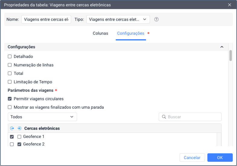 Ao criar um relatório com a tabela Viagens entre cercas eletrônicas, você pode definir os seguintes parâmetros adicionais: