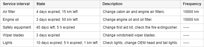 | Estado por quilometragem | O intervalo de quilometragem restante ou expirado para o serviço. |