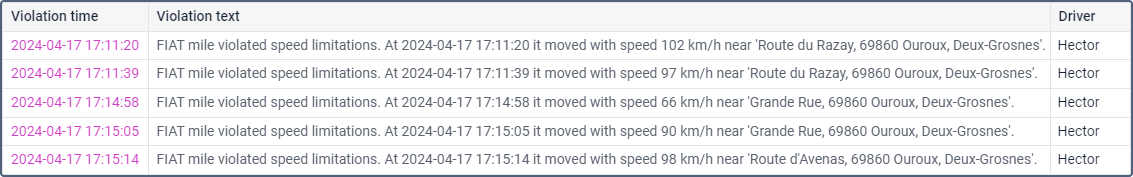 | Texto da infração | O texto do alerta ou a descrição do evento que gerou a infração. |