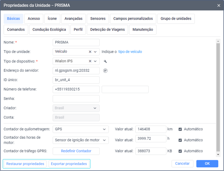 Os botões para restaurar e exportar as propriedades da unidade são exibidos na parte inferior da aba Básicas.