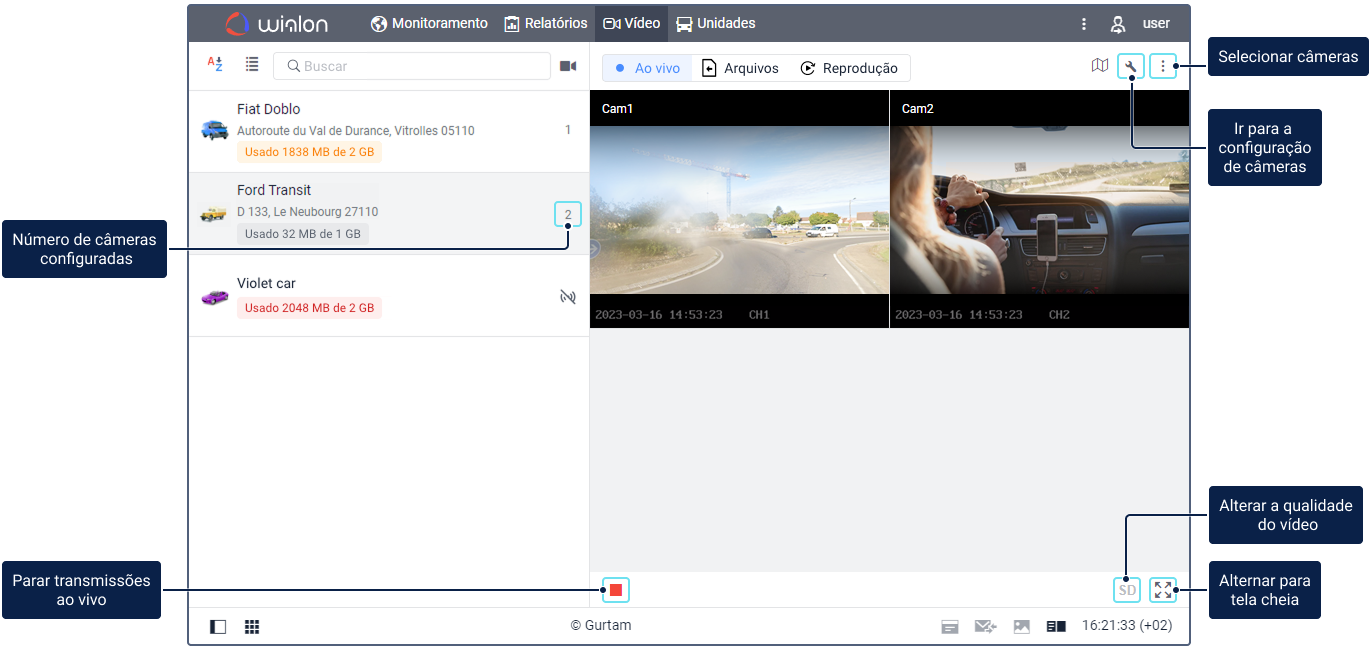 Nesta aba é possível assistir a transmissões ao vivo das câmeras da unidade e monitorar o movimento da unidade no mapa.