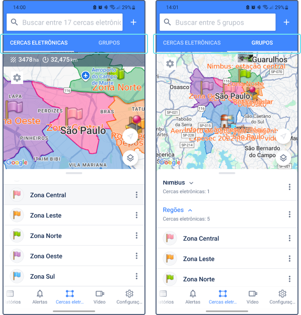 Dois modos estão disponíveis nesta aba: Cercas eletrônicas e Groupos. No modo Cercas eletrônicas é possível criar cercas eletrônicas e realizar as seguintes ações com elas: editar, copiar, excluir, criar alertas sobre cruzar as fronteiras da cerca eletrônica.