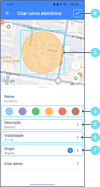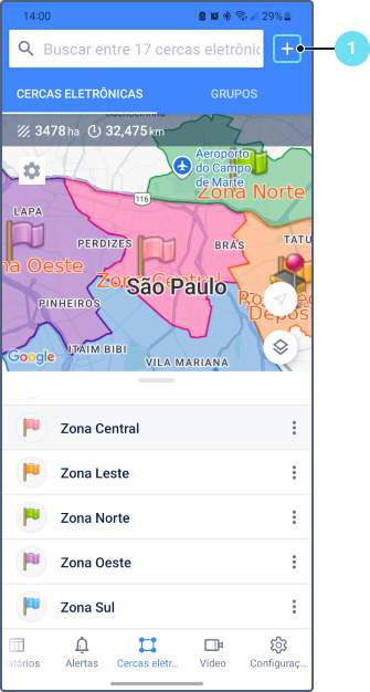 Só é possível criar cercas eletrônicas circulares pelo aplicativo. Siga estas etapas para criar uma cerca eletrônica: