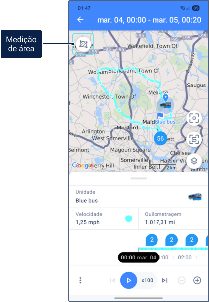 Você pode percorrer o percurso para ver onde a unidade estava em um determinado momento e como a velocidade e os valores dos parâmetros e sensores variaram.