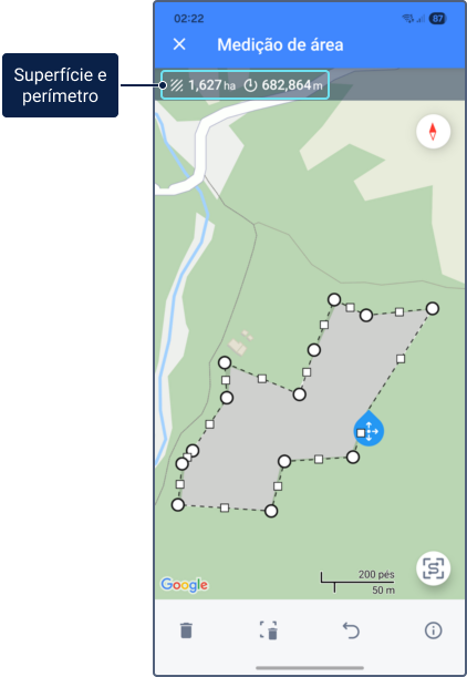 - Adicionar um ponto: Toque em qualquer lugar do mapa para inserir o primeiro ponto. Continue tocando para adicionar mais pontos e contornar a área desejada.