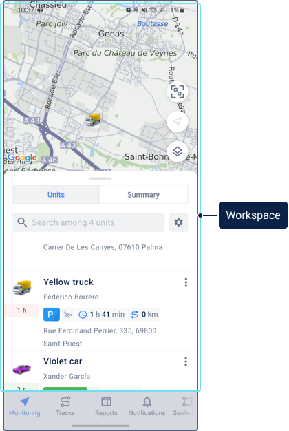 As abas Relatórios, Alertas e Cercas eletrônicas são exibidas caso os serviços Relatórios, Alertas e Cercas eletrônicas estejam ativados para a conta, respectivamente.