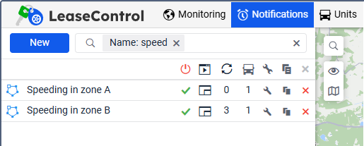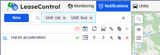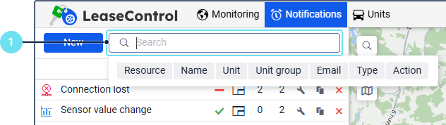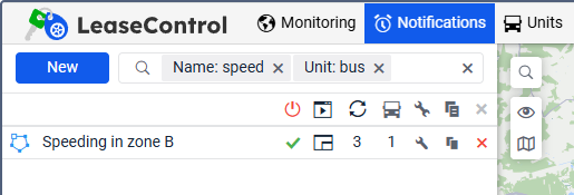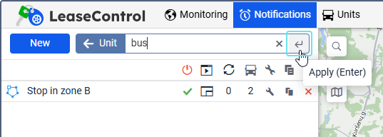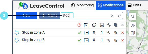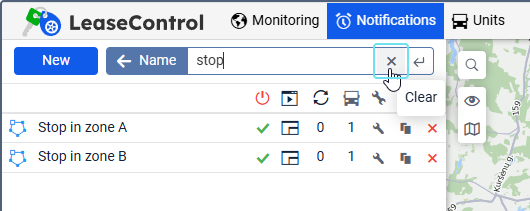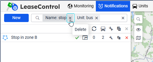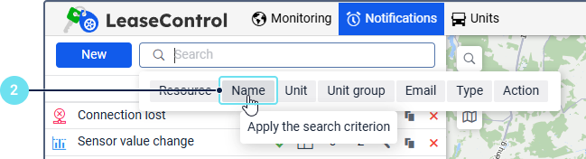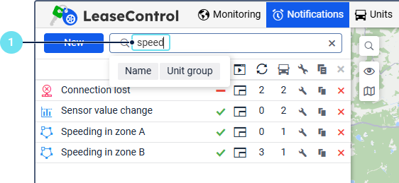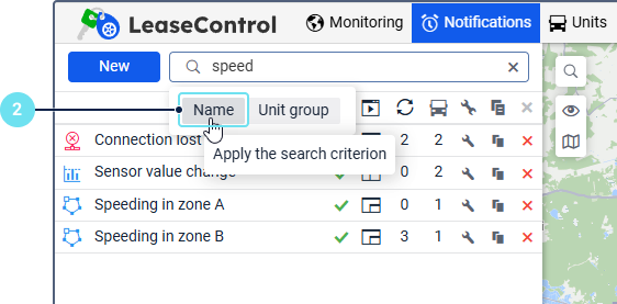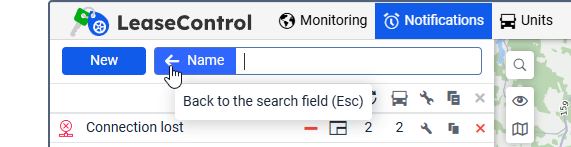 Под полем показываются все критерии поиска, которым соответствует ваш запрос. Например, если вы ввели скор и у вас есть уведомления с именем Превышение скорости, уведомления с типом Скорость и уведомления, созданные для группы объектов Скоростные автомобили, то под вашим запросом покажутся критерии Имя, Тип уведомления, Группа объектов. - Выберите критерий поиска.