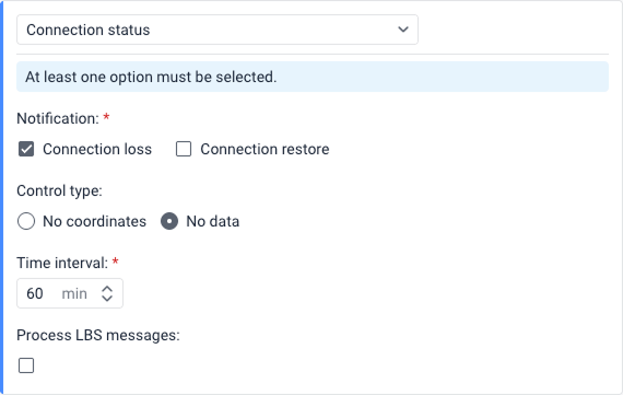 - Нет координат. Если выбрана эта опция, потерей связи считается отсутствие координат в сообщениях или самих сообщений. Возможна ситуация, когда отправляются сообщения с данными датчиков, но в них нет данных о местоположении объекта (например, в случае закрытия GPS-антенны).