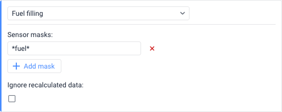 В разделе Маски датчиков вы можете указать одну или несколько масок датчиков, которые должны использоваться для определения заправок топлива и их объема. Нажмите кнопку Добавить маску, чтобы добавить поле ввода для новой маски.