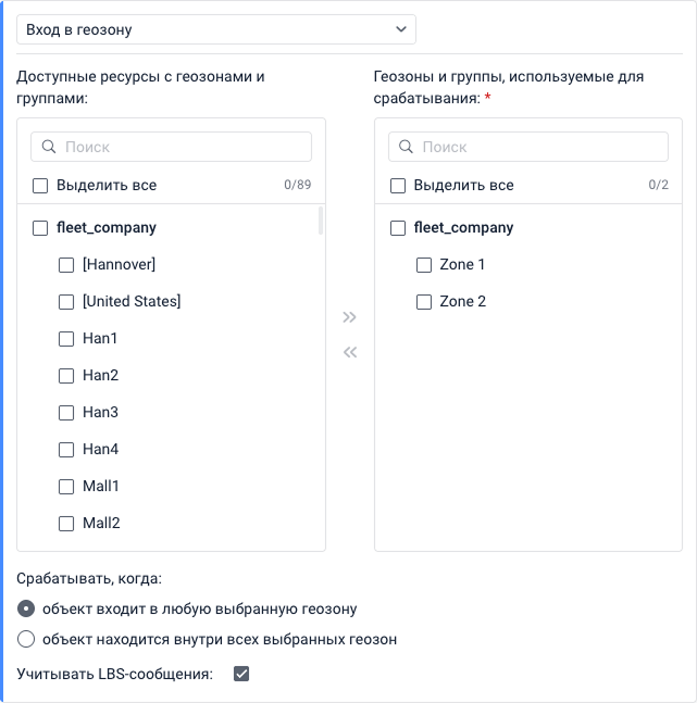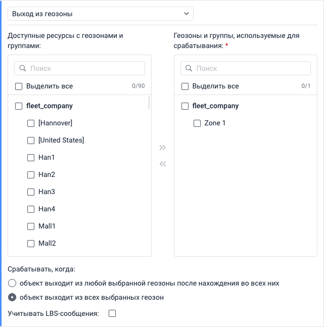 , переместите элементы из левого списка в правый. - Если выбрано несколько геозон, выберите, когда должно срабатывать условие: