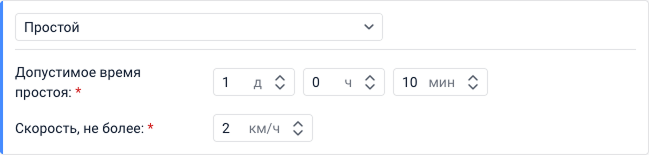 | Скорость, не более | Установите верхнюю границу скорости, при которой объект считается неподвижным. Обычно устаналивается в диапазоне от 1 до 5 км/ч, чтобы учесть возможные погрешности GPS-устройства. |