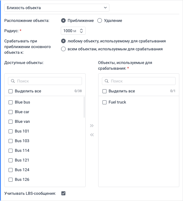- Выберите Учитывать LBS-сообщения, если хотите использовать LBS-данные для срабатывания уведомления. LBS-данные менее точные, но позволяют определить приблизительное местоположение объекта там, где GPS-сигналы могут быть слабыми или отсутствовать.
