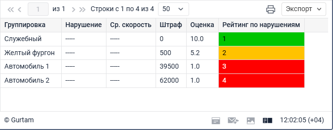 | Другие строки группировки | Сумма баллов за все нарушения в интервале группировки. | Сумма баллов за все нарушения интервала группировки, разделенная на количество минут определенной поездки в группе. | Сумма баллов за все нарушения интервала группировки, разделенная на количество километров определенной поездки в рамках группы. | Сумма баллов за все нарушения группового интервала, разделенная на количество минут моточасов в группе. |