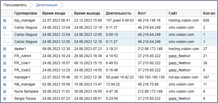 Ниже представлен пример таблицы с группировкой по пользователю и детализацией.