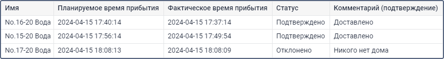 | Фактическое время прибытия | Время прибытия в точку доставки. |