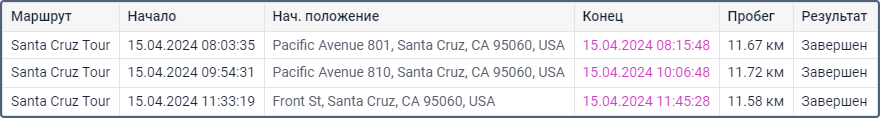 | Результат | Завершен (маршрут был успешно активирован, и впоследствии был зафиксирован вход в последнюю точку), не завершен (вход в конечную точку не обнаружен) или прерван (истек срок действия рейса или он был удален из таблицы вручную). |