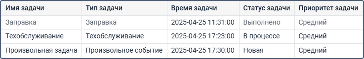 | Водитель | Имя водителя, назначенного на объект во время создания задачи. Если водителя не было, показывается прочерк. |