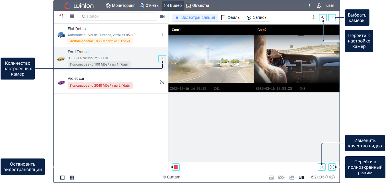На этой вкладке можно смотреть видео с камер объектов в режиме реального времени и следить за передвижением объектов на карте.