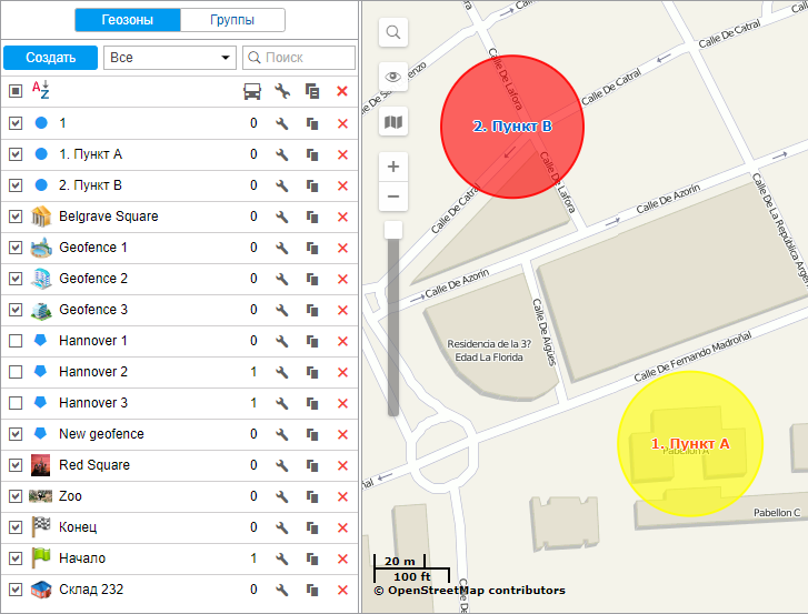 Чтобы получить отчет по поездкам между геозонами, нужно предварительно создать геозоны, определяющие начало и конец поездки. Предположим, что нужно перевезти груз из пункта А в пункт В и на это понадобится не один рейс. В таком случае необходимо создать соответствующие геозоны, а затем в шаблоне отчета указать их в качестве отправного и конечного пунктов.