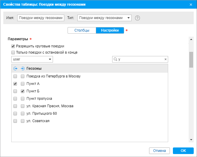 Выберите эту опцию, если начало и конец поездки или нескольких поездок должны находиться в одной зоне. При этом необходимо, чтобы какая-либо геозона или объект были отмечены как отправной и конечный пункт.