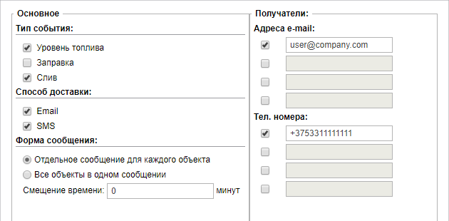 Вы можете быть уведомлены о детектированных заправках и/или сливах, а также о текущем уровне топлива по электронной почте или посредством SMS. Для определения заправок и сливов используются соответствующие настройки топливных датчиков.